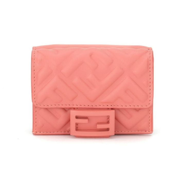 ピンクのナッパレザー製の、コンパクトな三つ折り財布。メタルパーツも、今季ラッキーカラーのピンクのエナメル仕上げ。隠しカードスロット3つあり。[ヨコ9.5×タテ7.5×マチ3㎝、カードスロット3、札入れ1、ボタン式コインポケット1]財布¥94,600(フェンディ/)