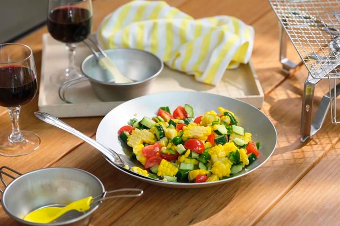 トウモロコシの弾ける食感やシャキッとしたキュウリの歯ごたえも楽しいマリネに、ぜひ合わせたいのは赤ワイン。清涼感のあるマリネとフルーティなライトボディの赤ワインのペアリングは、少し薄暗くなった夜のバーベキューをステキに演出します。夏キャンプの箸休めに、ぜひつくってみてください。