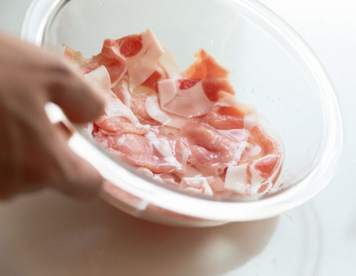 1. 耐熱ボウル(もしくは耐熱皿)に豚肉をばらしながら入れ、酒、水を加える。ふんわりとラップをかけ、レンジ(600W)で2分20秒加熱する。加熱後はよくほぐしておく(火の通りが弱ければ、再びラップをかけて少しおく)。