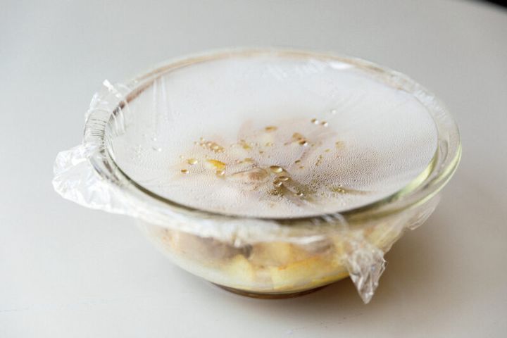 温め終えたらすぐにラップを取らず、そのまま置いておくことで素材にゆっくり熱が通る。