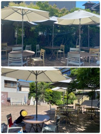 更に隣接する足湯カフェ坊っちゃんは、今年も!冷泉足湯!!はじまってましたぁ〜!! 以前、亀ヶ池温泉の巻でも、息子の温泉、足湯好きをとことん綴らせ頂きましたが、もうお風呂がチラリと見えてから入りたくてしょうがない息子。お店がオープンしたら、ゆっくりしていこうと!ひとまず、暑さしのぎのためにも、ガーデンパラソルの下で一休み。