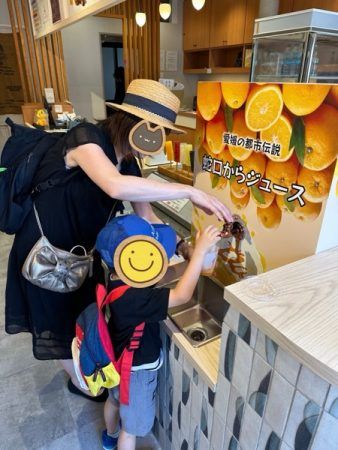 私が学生時代、上京していた頃、よく「愛媛って、みかんジュース専用の蛇口があるの?」って言われていた都市伝説が、今や実現され、道後はもちろん、県内のいろんな場所で、見られるようになってましたが、何気に、息子は初体験!!