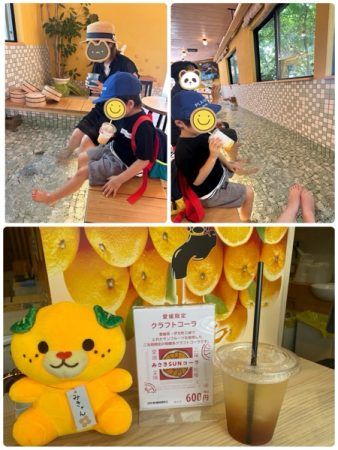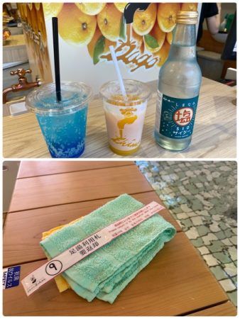 それぞれ、真夏にスカッとなるようなドリンクを購入し、足湯チケットも購入!!利用時間は最大30分。大人200円、タオル付き。子供は小学生から有料ということで、息子はまだ無料で利用させて頂きけるということで、感謝!!ありがとうございます!!