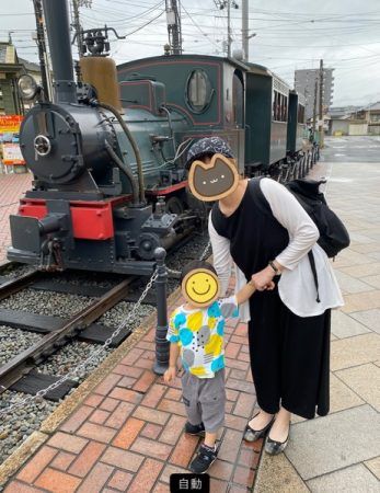 実は道後はホームグラウンド! パパと電車大好きな息子と道後公園からスタートし、道後温泉駅で行き交う電車を眺めて、こんな風に坊っちゃん列車バックに記念撮影したり…