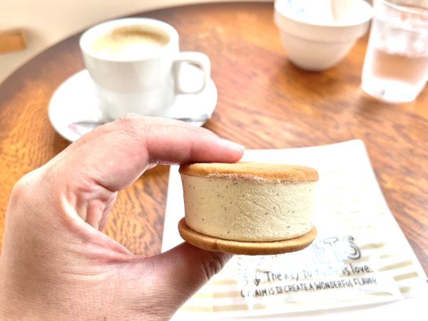 さっそく食べてみると、フィリングがギモーヴやマシュマロのようになんとも言えないモッチリ感があります!でももちろんマシュマロサンド等ではなく、あそこまでの弾力もありません。ちなみに味は確かにバニラ味です。