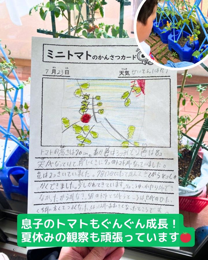 どうやら授業でトマトについて学んだ時、もし夏休み中に茎が折れちゃったらこうしてね!と先生に教えてもらったんだそう。