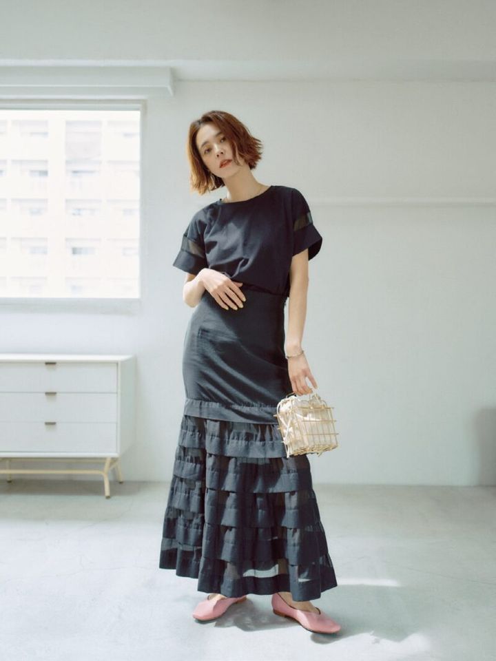 ☑Tシャツもスカートも 部分シアーで黒を涼しげに