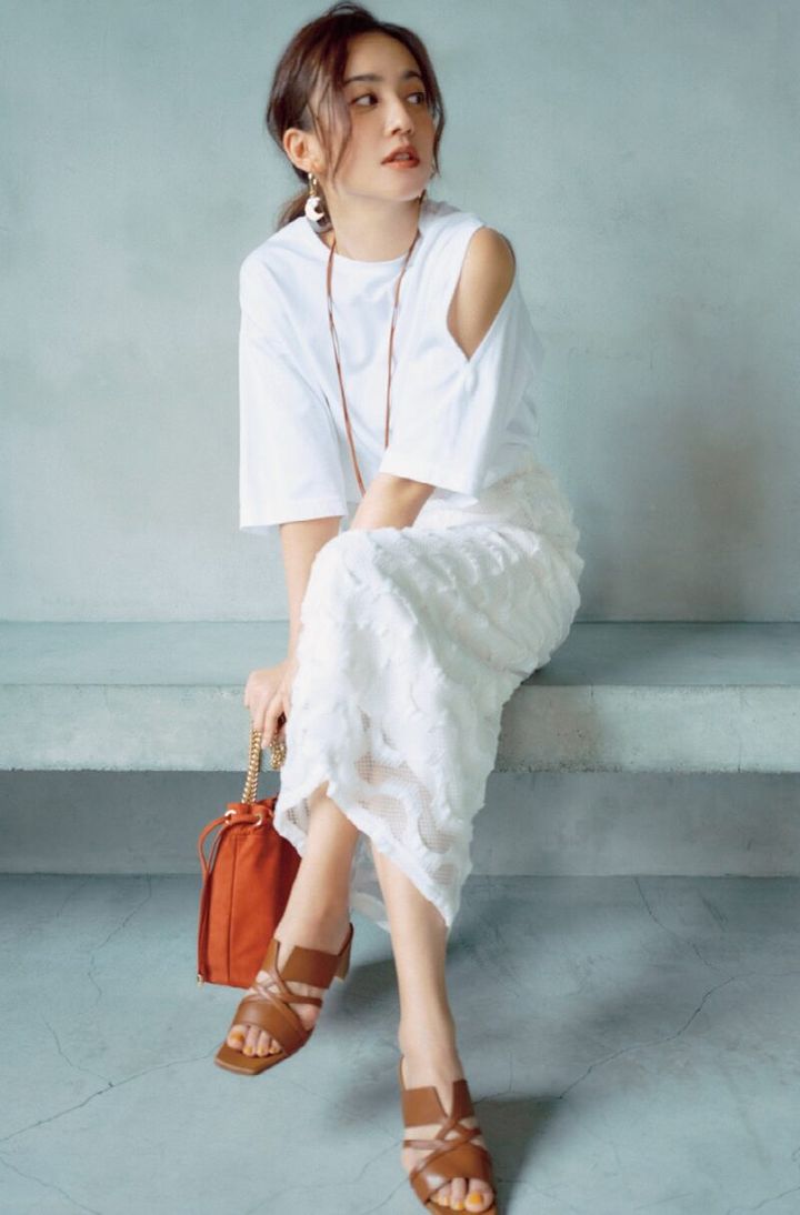 透けるレースのウエストゴムスカートに、片側オープンショルダーのTシャツでエッジを加えて。茶系小物でナチュラル&上品に。T