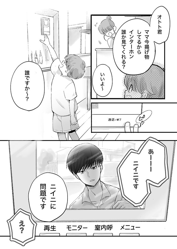 10歳差兄弟のニイニとオトト君。16歳のニイニは弟思いの優しいお兄ちゃんだけど、思春期まっただなかの高校生でもあり……。今回のテーマは、オトトくんが家のインターホンでのできごとです。