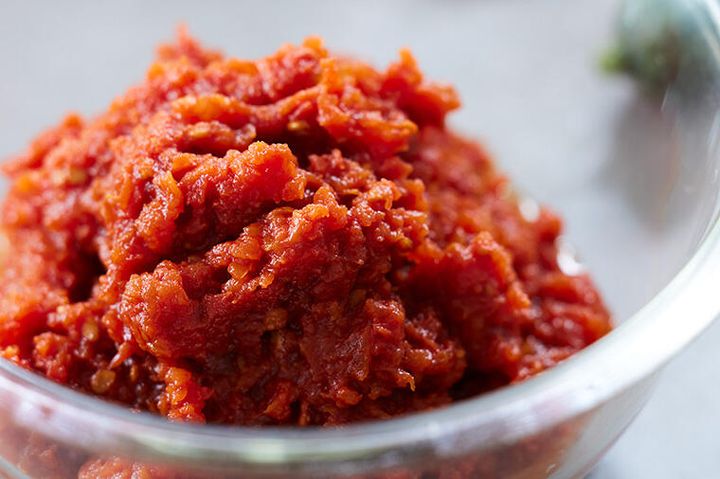 サルチャはトルコでよく使われる調味料。トマトを発酵させて、それを煮詰めます。スープやパスタ、煮込みのソースなど、幅広く使えるのも魅力です。チリパウダーを入れると、少しピリッと辛いアクセントが生まれます。