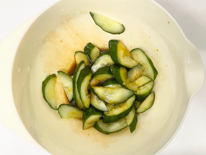 3. ボウルにきゅうりと1の合わせ調味料を入れ、混ぜ合わせます。