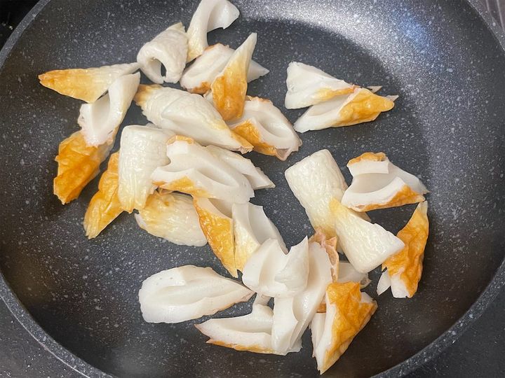 2. フライパンを中火にかけ、油を引かず、ちくわの全体に焼き色がつくまで焼きます。