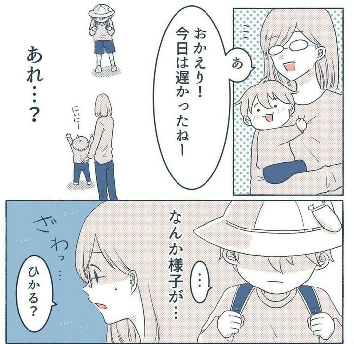 いつもより帰りが遅かった息子のひかるくん。ななみさんはいつもと様子が違うひかるくんを見て、心がざわつきます。帰宅途中、ひかるくんは誰かに声をかけられていました。そのことと何か関係しているのでしょうか…。心配ですね。