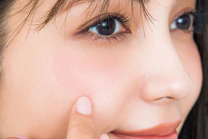 目尻の真下に、大きめのハート型にチークをオン。萎みがちな目尻下をふっくらとさせれば顔全体に多幸感アップ。細かいシミやそばかすも目立たなくする効果も。