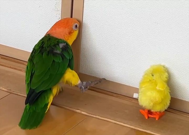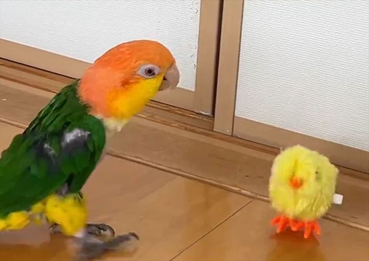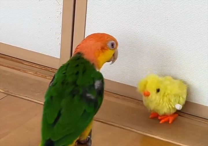愛嬌のある顔と動きでペットとして人気のシロハラインコ。 ひよこのぬいぐるみにキックした時のリアクションが面白いと話題になっています!
