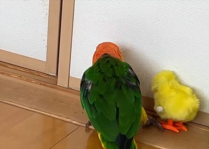 「ちょ・・・動くやん!」ひよこのぬいぐるみにキックしたシロハラインコ のリアクションが話題に