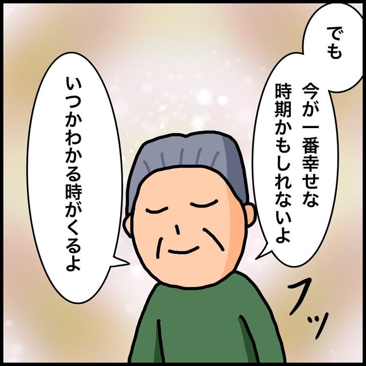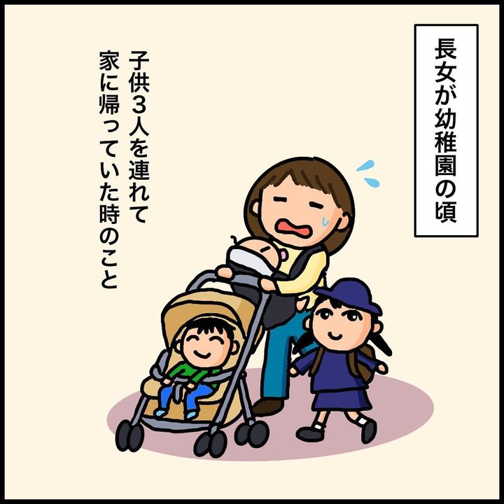子ども3人を連れて家に帰っていると、近所の男性が、「大変そうだねぇ でも今が一番幸せな時期かもしれないよ いつかわかる時がくるよ」と言います。子どもたちが成長し、その言葉の意味がよくわかったおも茶さんなのでした。