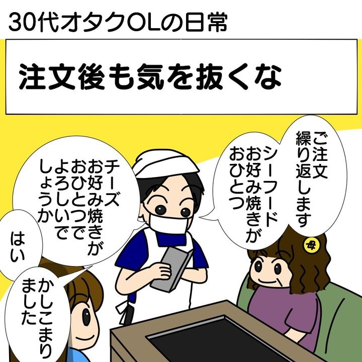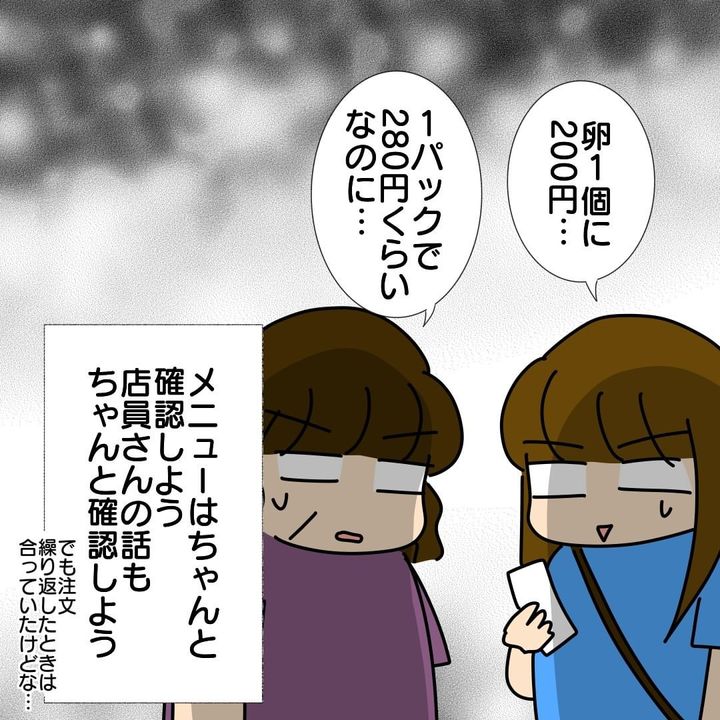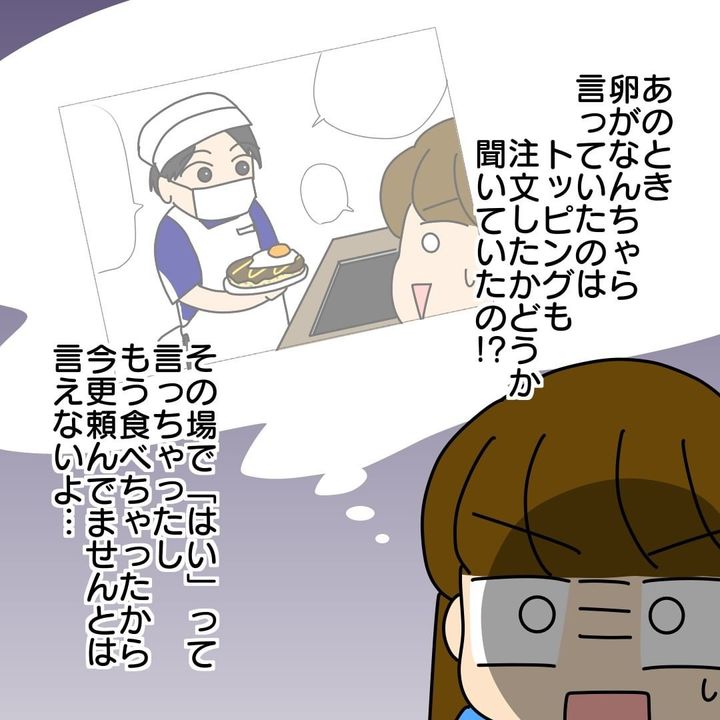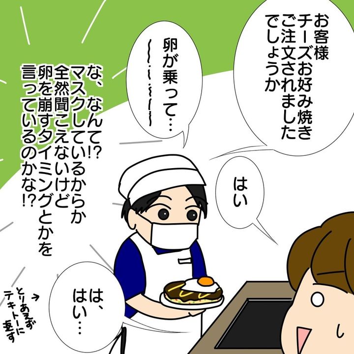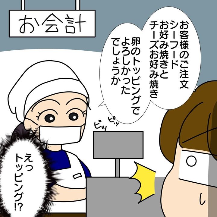 お好み焼き屋の店員の話がよく聞こえず、ひとまず「は、はい…」と答える塚田うさぎさん。「てゆーか卵なんて乗っていたっけなぁ まあいっか」と不思議に思っていたところ、会計時に、頼んでいないつもりだった「卵のトッピング」が含まれていたのでした。