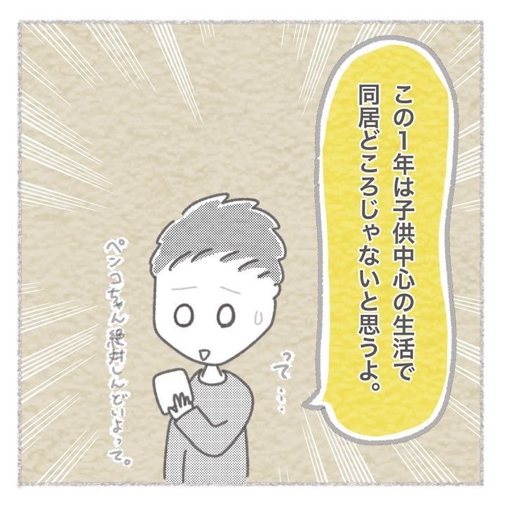 義母との同居について、夫が兄弟に相談したところ、「この1年は子供中心の生活で同居どころじゃないと思うよ」とのこと。兄弟の適切なアドバイスに、ホッと胸を撫でおろしたペンコさんなのでした。