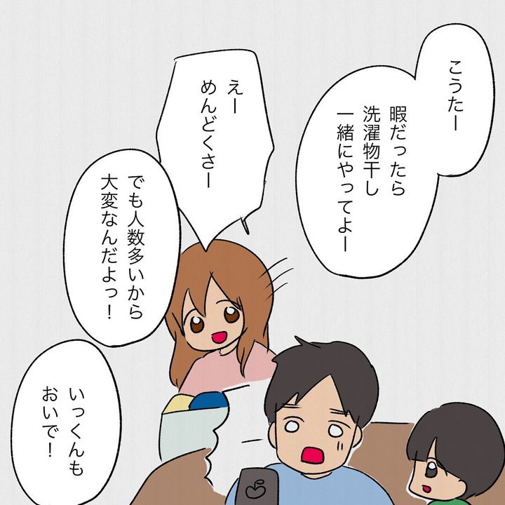 誰かに家事を手伝ってほしいものの、言い出せないメイさん。「一郎 椅子持ってきて!これ取ってくれる?」と手伝いをお願いする想像をしますが、「めんどくさい 自分でやればいいや」と諦めてしまうのでした。