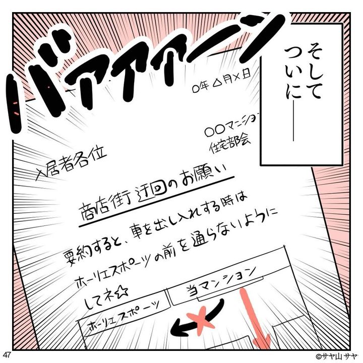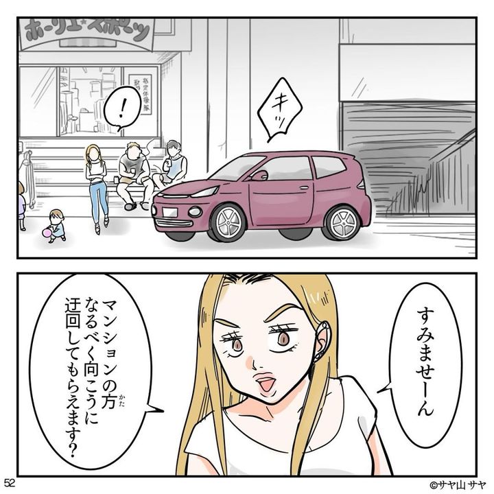 意を決してホーリエ一家のお店の前に車を出し、面と向かって「ここはホコ天じゃねーーーッッ!!」と、鬼の形相で怒りをぶちまけるのでした。しかし、その後に襲ったのは後悔の念。「仕返しされない?」「家族に何かあったらどうしよう?」とうわの空で仕事をすることになってしまいます…。