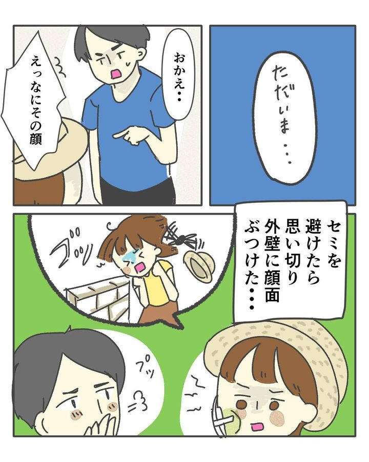 玄関を出ると、セミが飛んできて、悲鳴をあげるちぇるしーさん。セミを避けようとしたところ、外壁に顔をぶつけてケガをしてしまったのでした。