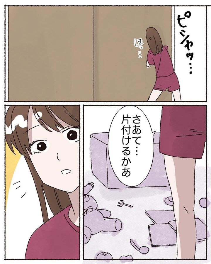 現在は子育てで部屋の散らかり具合を気にする余裕がなくなってしまったそう。むちゅめちゃんが寝静まってから部屋を片付けようと動き出すと、上手に積み重なったおもちゃを見つけてふと手を止めてしまいます。散らかったおもちゃの中から娘の成長や愛しさという“お宝”を発見する、今の生活も悪くないと思うしおさんなのでした…!