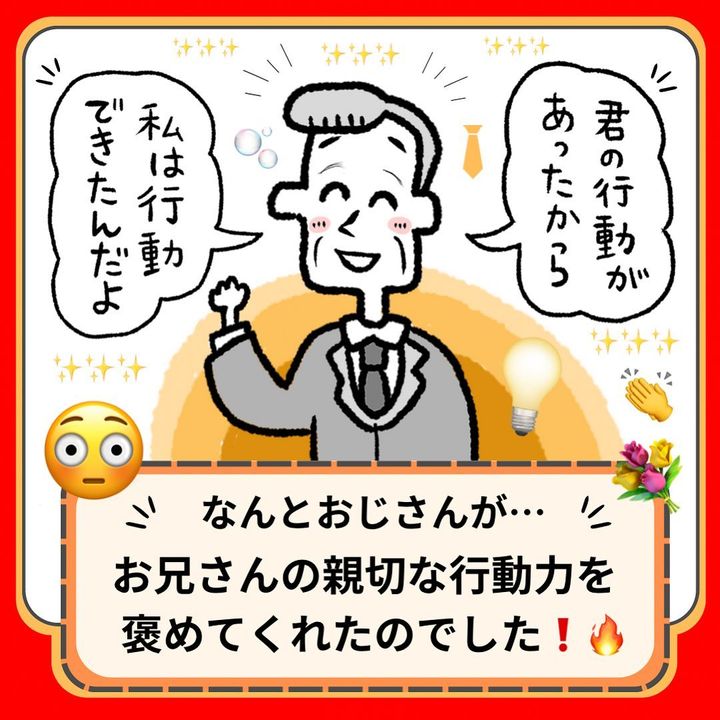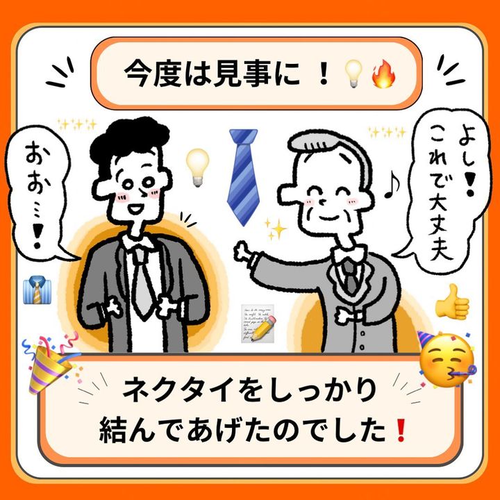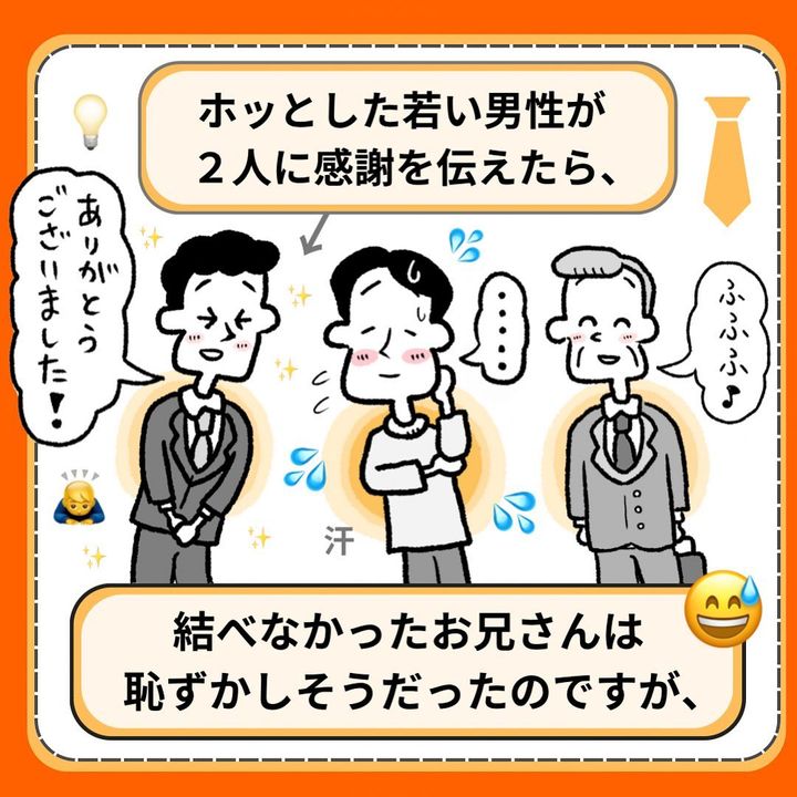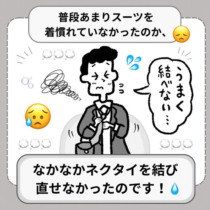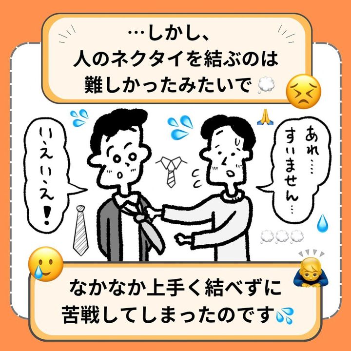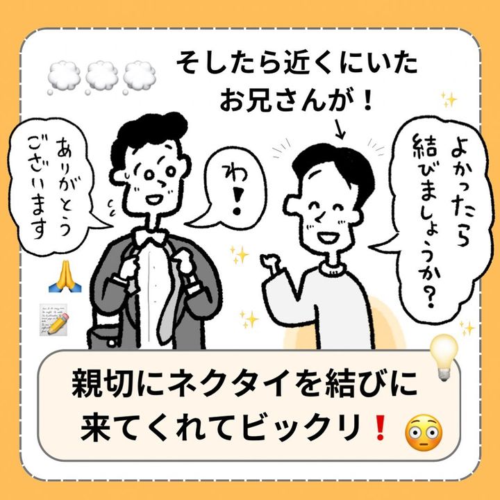 近くにいたお兄さんが「よかったら結びましょうか?」と声をかけます。しかし、自分のネクタイは結べても人のネクタイを結ぶのは難しかったようで苦戦。そこにスーツを着たおじさんが登場し、ネクタイをしっかりと結んであげたそう!恥ずかしそうにしていたお兄さんですが、おじさんはお兄さんの親切な行動力を褒めるのでした。