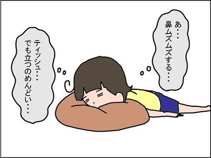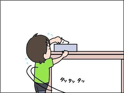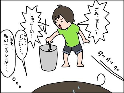 なーさんに、「ママにティッシュ取ってきて~」と頼んだところ、「あい!ちょっとまっててね!」。ティッシュを取ってきてくれますが、ティッシュで自分の鼻を拭き、そのままゴミ箱に捨ててしまうのでした。