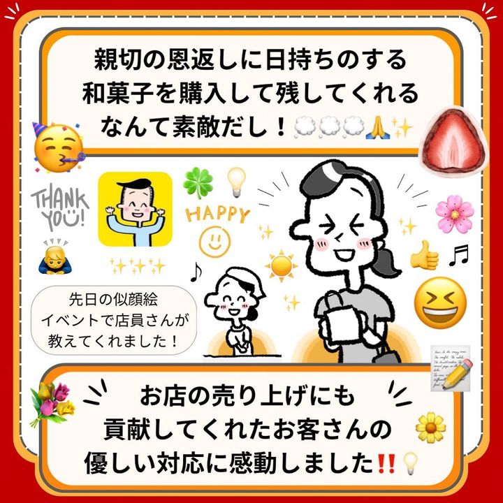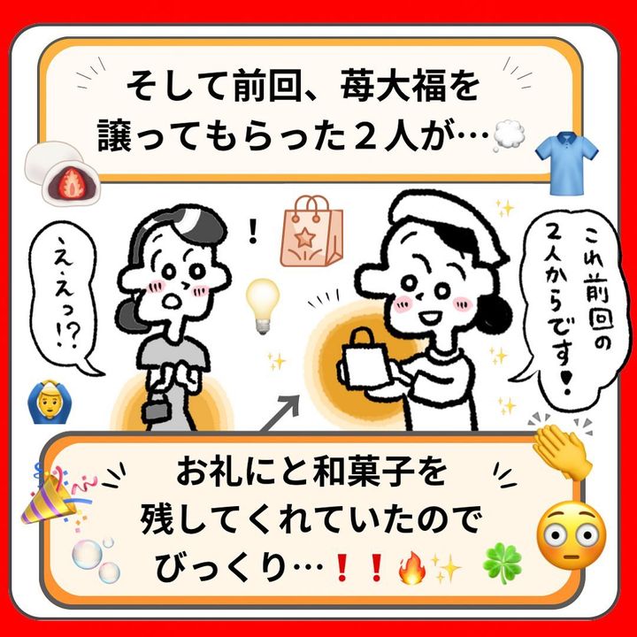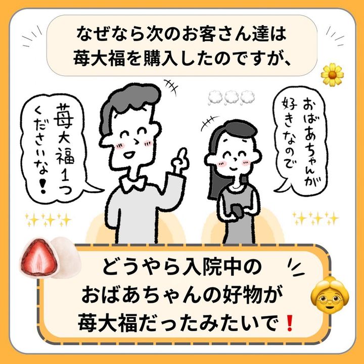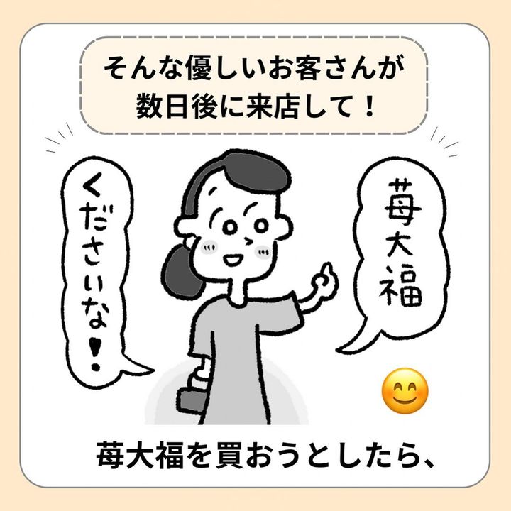 入院中のおばあちゃんに大好物の苺大福を買っていこうとしていたお客さんに、1つだけ残っていた苺大福を譲った女性。後日、彼女が苺大福を買いに来た際、店員さんはお礼を伝え、苺大福を譲ってもらったお客さんから預かっていたお礼を渡したそう。1つの苺大福からたくさんの人が笑顔になる“ハッピーの連鎖”が生まれたのでした…!