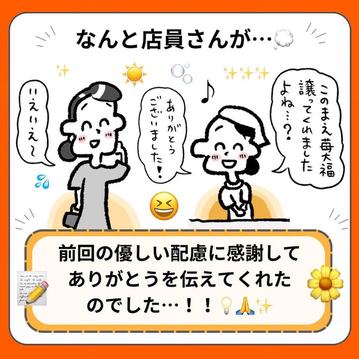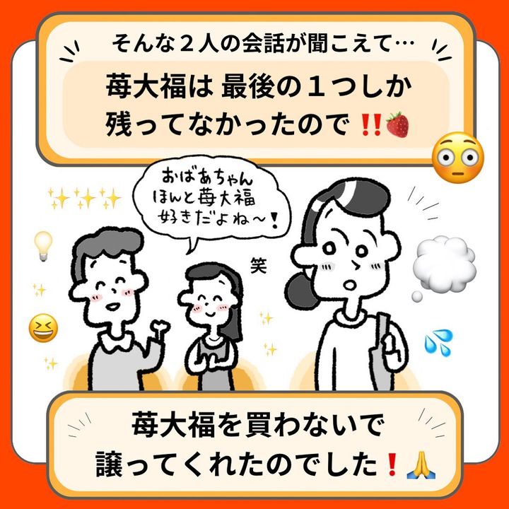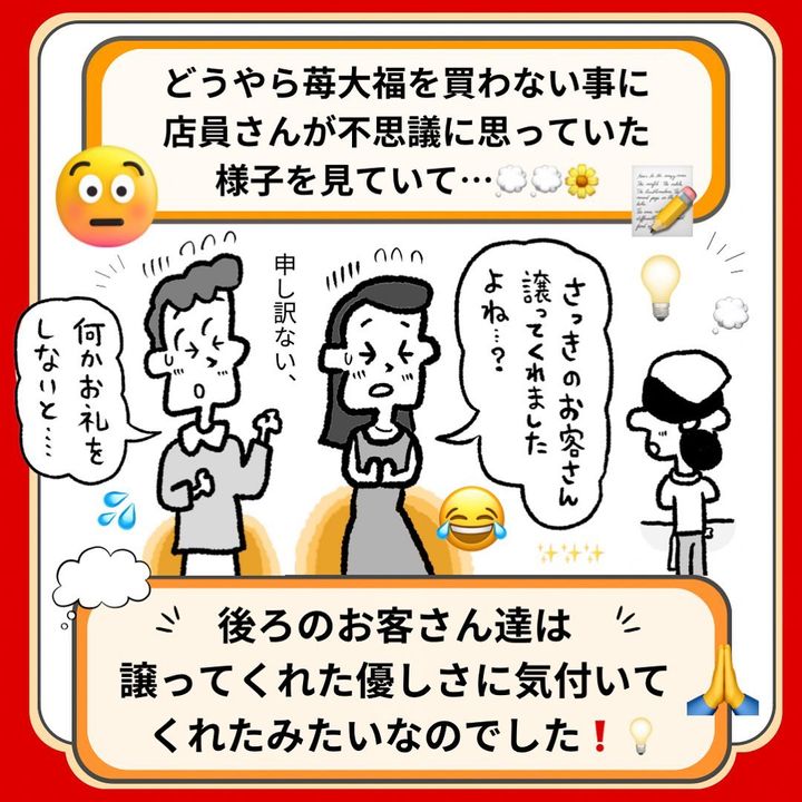 いつも買っていた苺大福をそっと譲った女性も、その優しさに気がついた店員さんもお客さんもステキ…!投稿元のコメント欄には「思いやりがつながってとても優しく温かい世界」「世界がこんな優しさで溢れたら戦争なんて起きないのにね」「こちらの投稿はいつも心が温かくなるエピソードなので、本当癒されます」など、感動の声がたくさん寄せられていました。