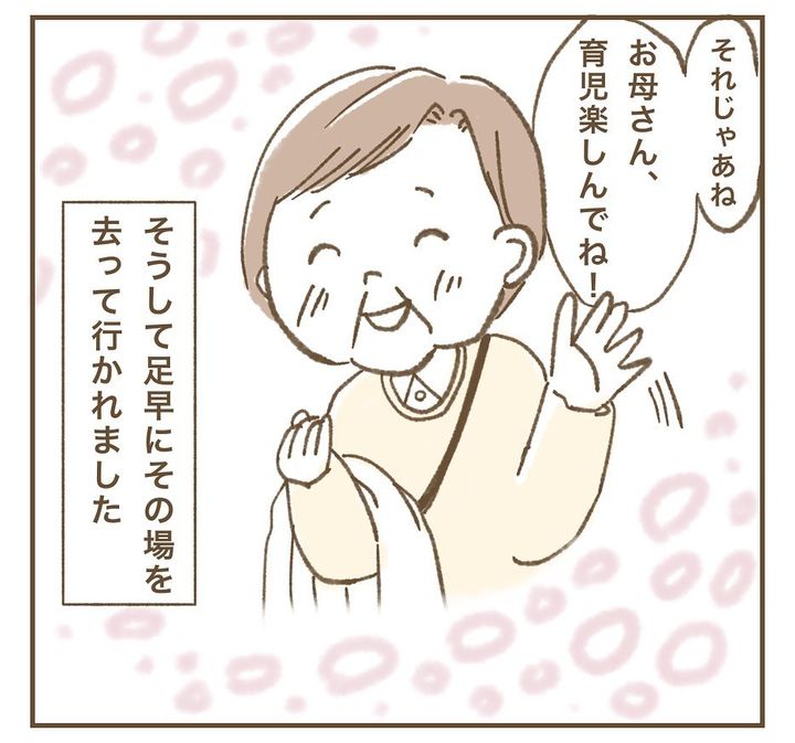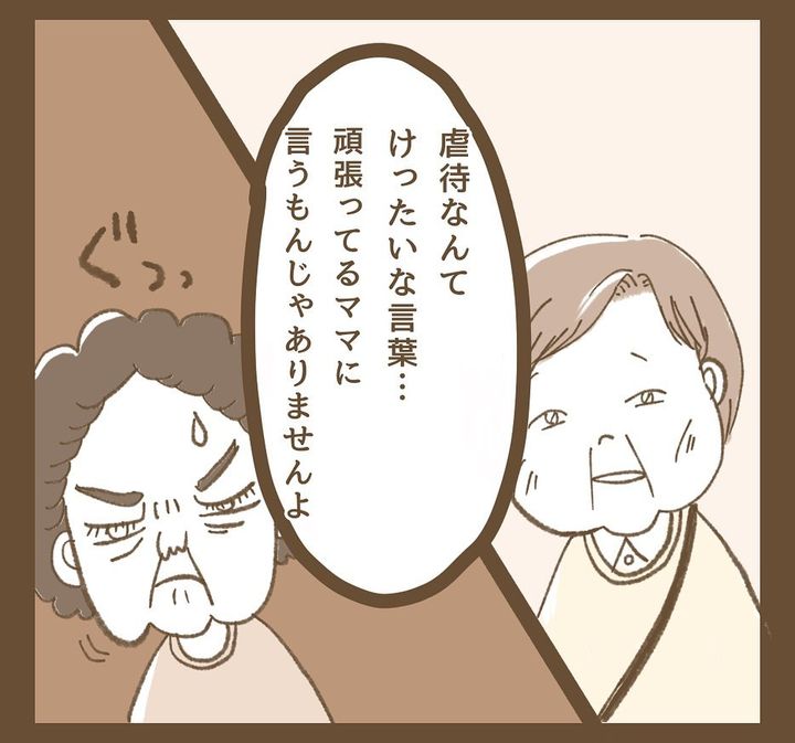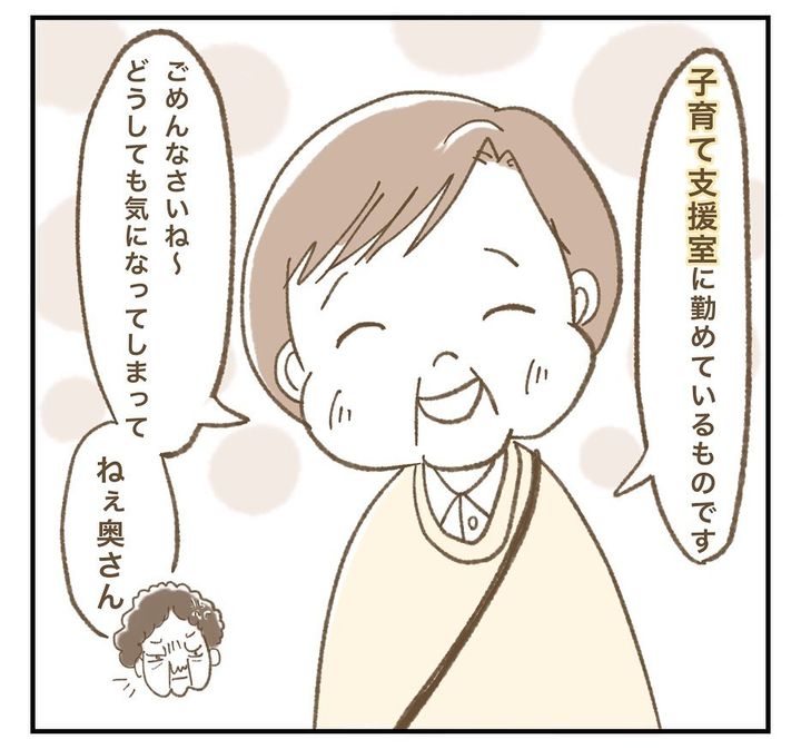 ねぼすけさんが説教に耐えていたところ、子育て支援室に勤めているという女性が現れた!彼女は、赤ちゃんと外出しても問題ないことや、ねぼすけさんがきちんとケアしていることを説明し「虐待なんてけったいな言葉…頑張ってるママに言うもんじゃありませんよ」とピシャリ。おばさんが退散した後「お母さん、育児楽しんでね!」と、優しい笑顔と温かい言葉をくれたのでした…!