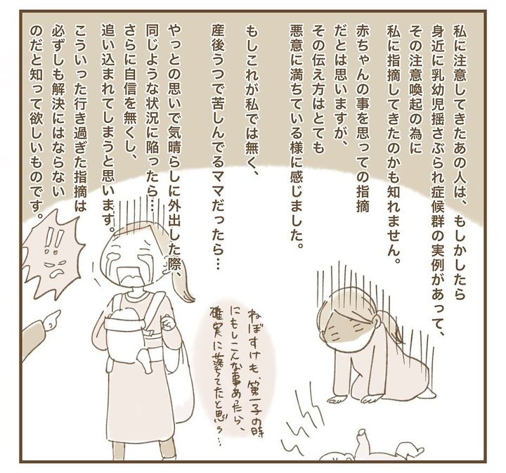 ママだって、外に出て気晴らしが必要です。おばさんのように一方的な言い方をされたら、とてもつらいのではないでしょうか。投稿元のコメント欄には「支援員の方のお声がおばさま世代の方みんなに伝わればいいのに…!」「支援センターの方、素晴らしい」など、支援員さんを称賛する声が多数寄せられていました。