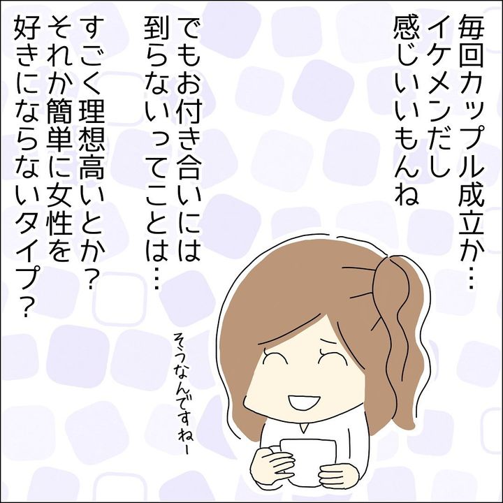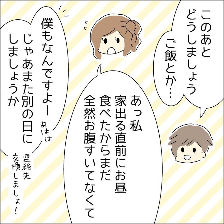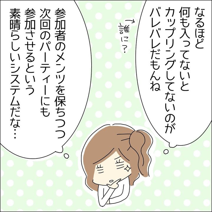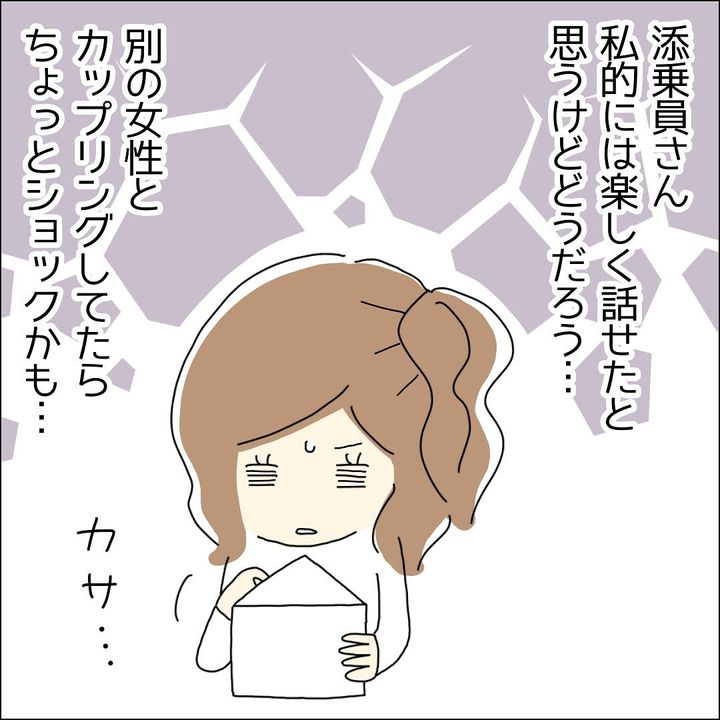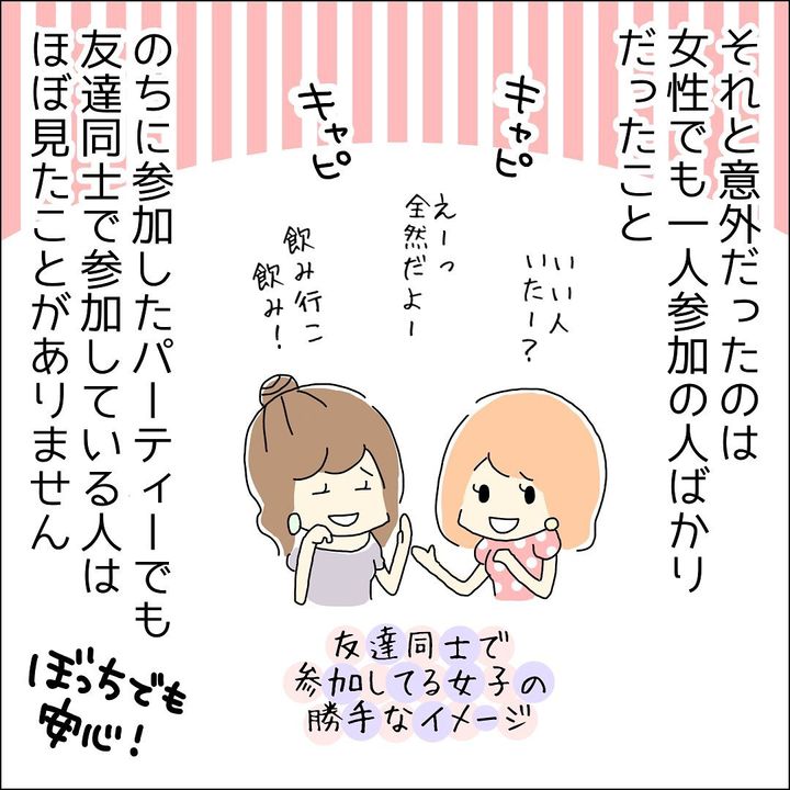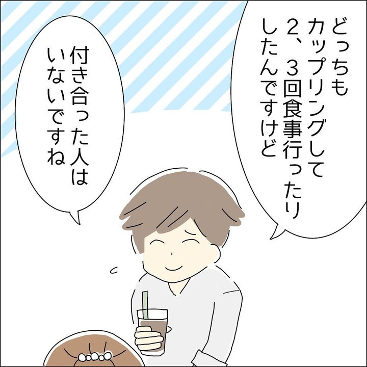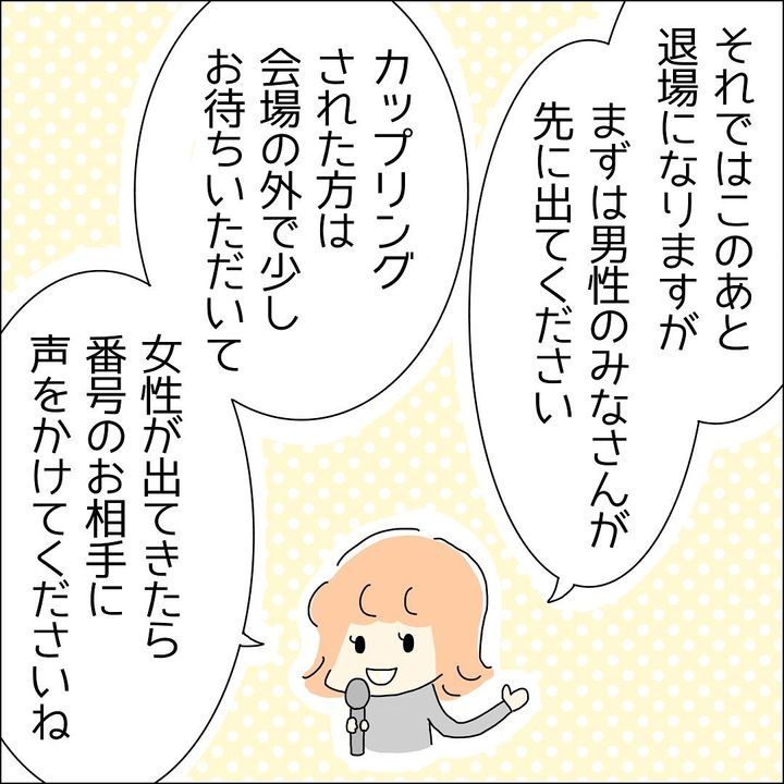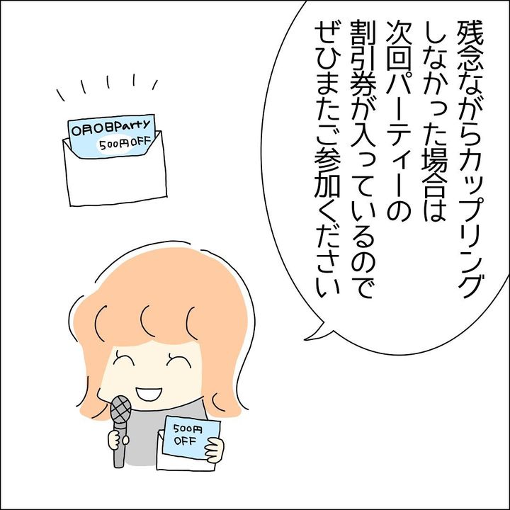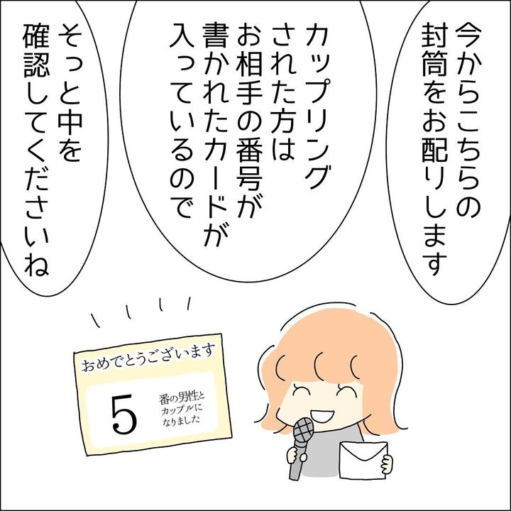 初めて参加した婚活パーティー。カップリングの成立は封書で告げられたり、カジュアルな服装や、1人で参加している女性が多かったりと、イメージしていたものと違う部分も多々あったそう。ワクワクドキドキの初参加でしたが、無事カップリングが成立!お茶をして、連絡先を交換して…。これからどうなるのか、展開に胸躍らせるのでした…!