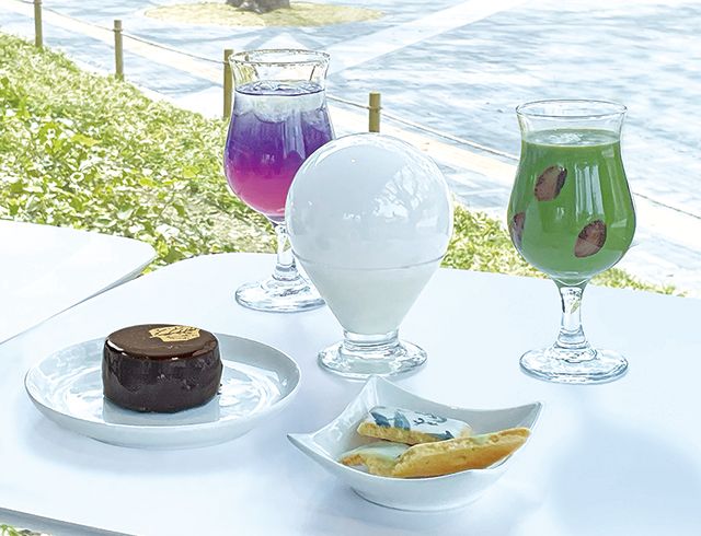 全面ガラス張りの開放的な店内には、収蔵品をモチーフにしたドリンクやスイーツがスタンバイ。陶片クッキー(500円)のほか、フレーバーバブルとパンナコッタで表現した「白磁刻花」(1,000円)はインパクト大。