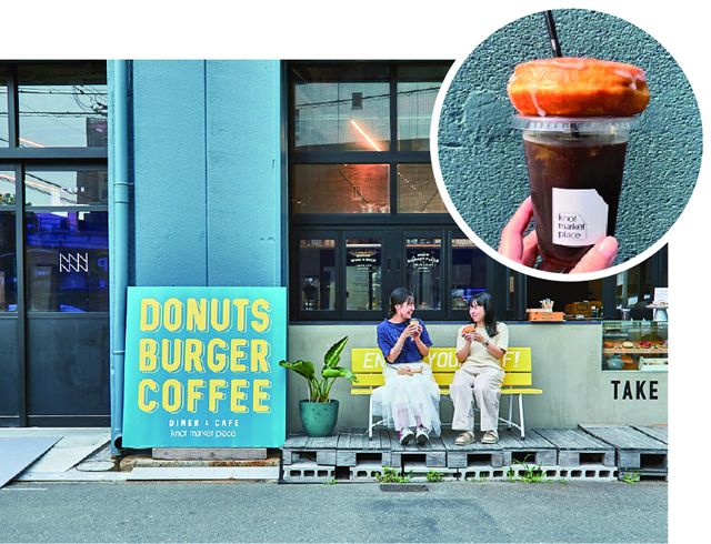 元自動車部品工場をリノベした、まるで工場内のような雰囲気を味わえるカフェ。7月にリニューアルし、2階のギャラリーでも、イベントがないときは、テイクアウトしたドーナツなどを食べられるように。アンティーク家具を取り入れたオシャレな空間を楽しんで。