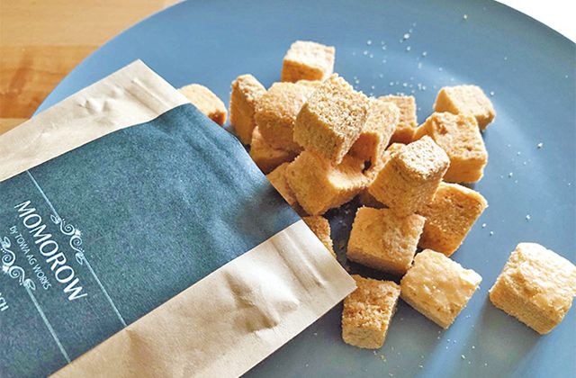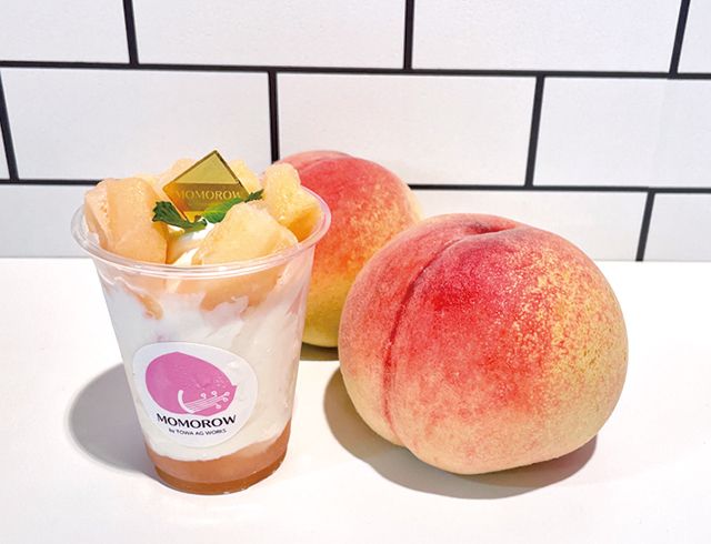 山梨県の高品質な「春日居の桃」を産地直送で販売。素材を生かした「桃のバウムラスク」(780円)など、焼き菓子も人気です。日によって、「ピーチ パフェ」(580円)といった、果肉たっぷりのスイーツも登場。