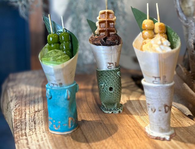 創業約100年の麩のメーカーが手掛ける「生麩みたらし&カフェ」。ポン菓子、クッキー、アイスクリーム、エスプーマの上に生麩みたらし団子がのったパフェ(抹茶・ワッフル・きな粉各600円)など、ほかにはないメニューがそろいます。