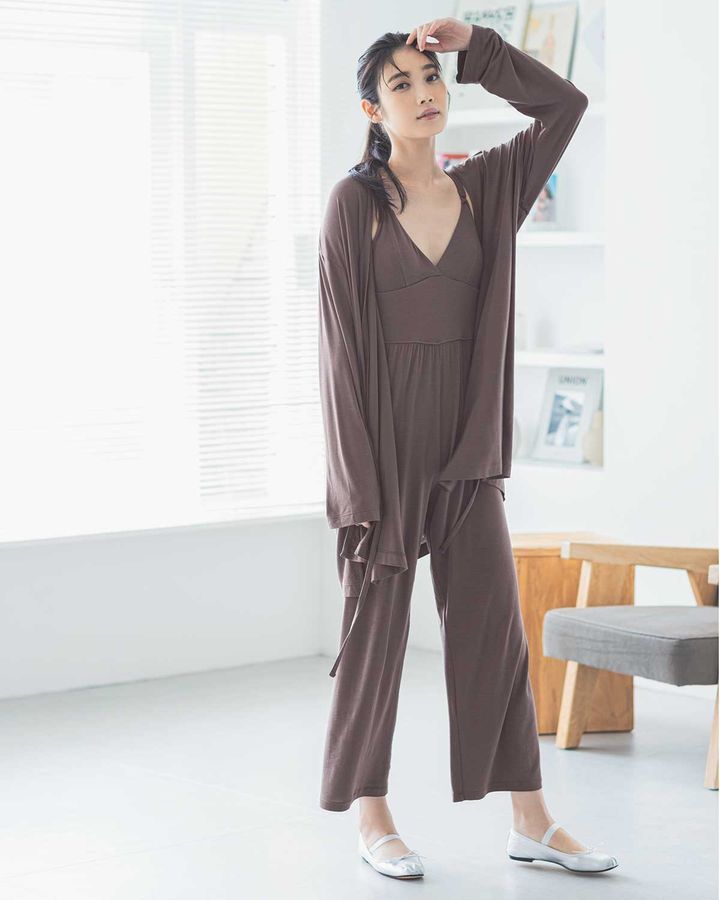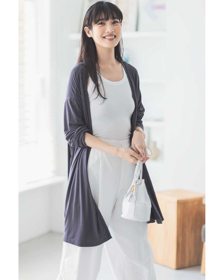 カットソー×パンツなどにサラッと羽織れば、ルームウェアとしてだけでなく普段使いもできます。ガウン¥8,800(サク・レ/買えるCLASSY.)タンクトップ¥13,200(ボーダーズ アット バルコニー)パンツ¥19,910(リネイヴ/ネイヴ)バッグ¥19,800(ダブルスタンダードクロージング/フィルム)バングル¥30,140(ソコ/ZUTTOHOLIC)