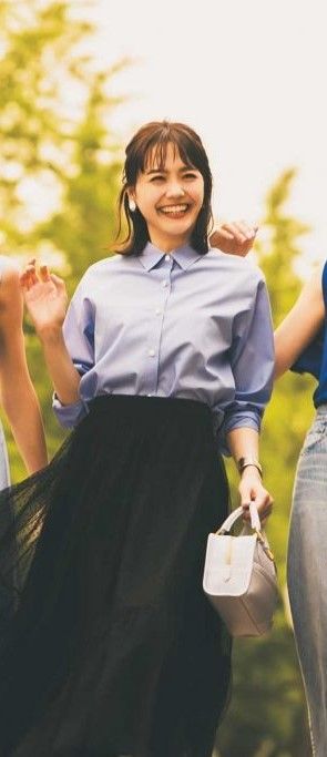 シャツ×黒ボトムスの定番コーデは、透け感が楽しいチュールスカートを選ぶことで一気にあか抜けた印象に。シャツの裾をスカートにインすれば、自然にスタイルアップが叶います。仕上げにホワイトのアクセサリーとバッグを投入し、明るくクリーンな雰囲気に。