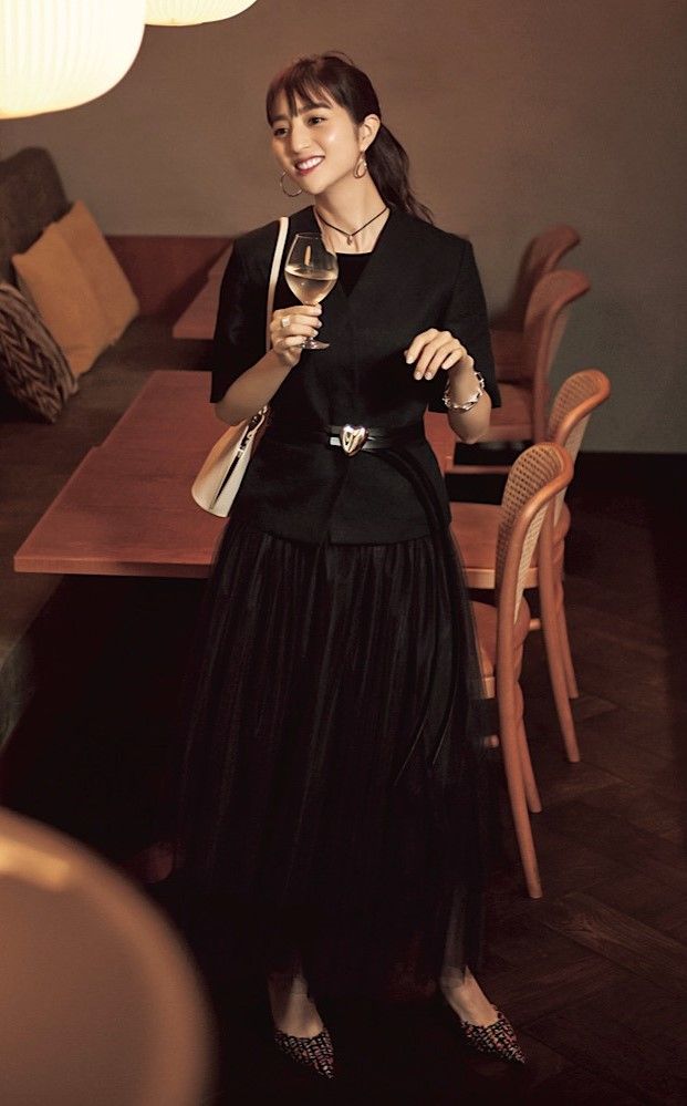 落ち着いた印象のブラックコーデこそ、ディティールに凝るのが大人流。チュールスカートやハートモチーフのベルトなどの甘口アイテムを際立たせ、レディなムードを楽しんで。仕上げに大ぶりなアクセサリーで華やかに盛り立てれば、会食やデートにもぴったりの大人コーデが完成します。