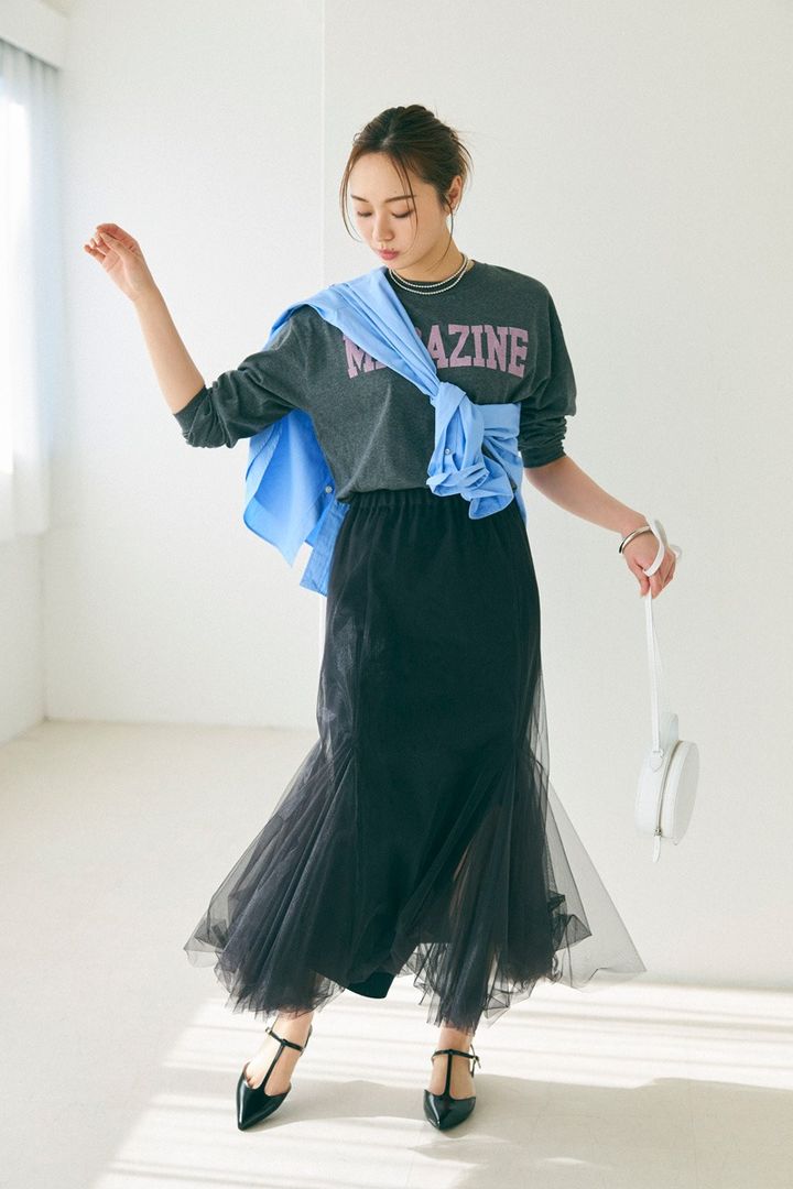 ガーリーな黒のチュールスカートは、ロゴTやシャツとともにラフに着こなすと今っぽさ倍増。膝下から広がるマーメイドシルエットを選べば、腰まわりがすっきりと見えスタイルアップが叶います。アクセサリーや小物はエッジの効いたものを選んでさらにコーデを盛り上げて。