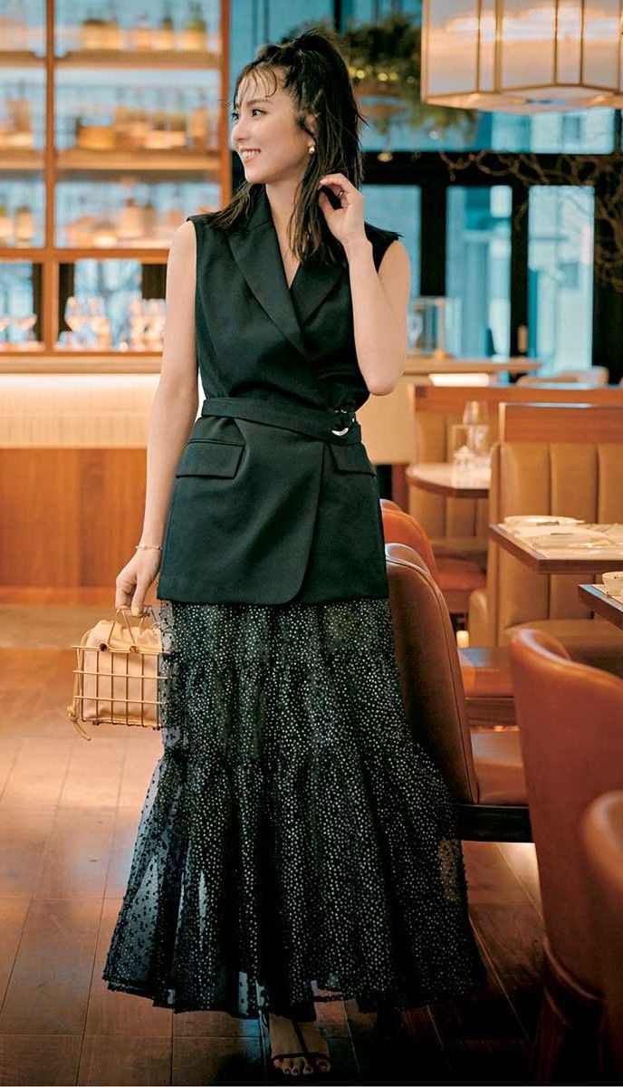 フェミニンなチュールスカートは、ブラックを選べば冒険しすぎず取り入れやすい。ウエストベルト付きのジレでキリッと引き締めれば、今っぽい甘辛バランスに仕上がります。全身ブラックでまとめたぶん、ポイントになるかごバッグで抜け感を演出。