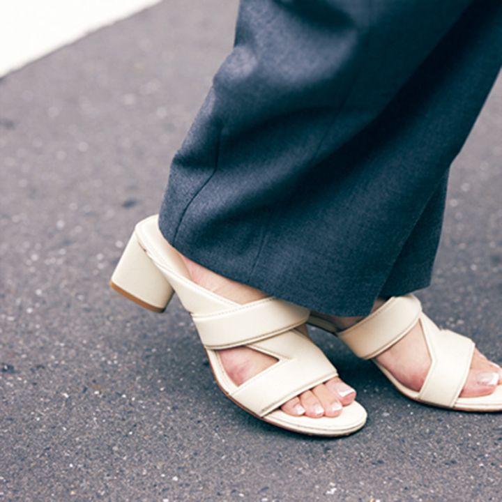 お仕事中も足元はあまり目立たないので、サンダルで外してオシャレを楽しみます。甲がしっかりホールドされ歩きやすく質感も雰囲気があって◎。