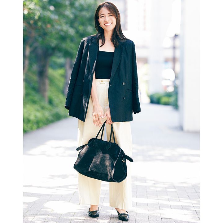 メンズのサイズ感ならコンサバになりすぎず、さっと羽織ればきちんと感が出るので助かります。中はノースリジレのセットアップでツインっぽく。丸めてバッグに入れてもシワ知らず、洗濯機で丸洗いできて夏は大助かり。THE ROWのパークトートは白黒茶の3 色揃えたほどお仕事名品。