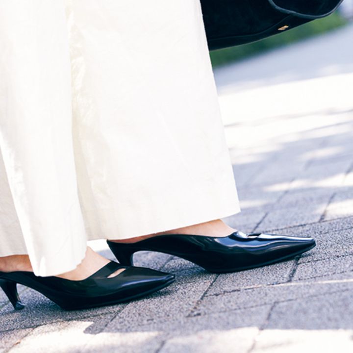 華奢なちょいヒールで高揚感のあるDRIES VAN NOTENのミュール。かかとレスでもきちんと見える名品シューズです。ジャケット&パンツでかっちりしている分、足元には少し抜け感を。
