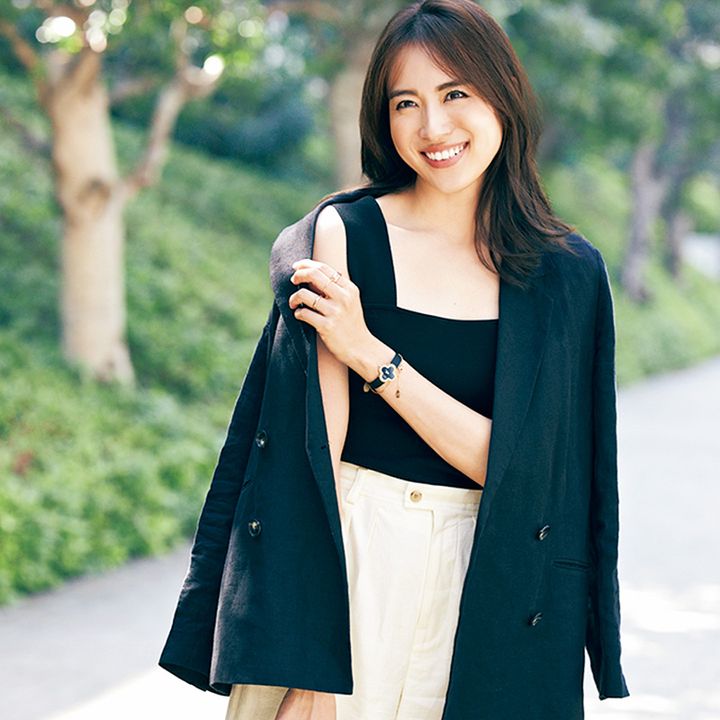 アナウンサー時代の名残りもあるのか、TPOを意識すると甘い要素を効かせたくなります。普段はブラウスを着る機会が多いですが、きちんとシーンはやっぱりジャケット。スクエアネックのタンクはカジュアルすぎず、この夏活躍の予感。服がシンプルな分、靴やアクセに甘い要素を入れて自分のオシャレ欲も満たします。