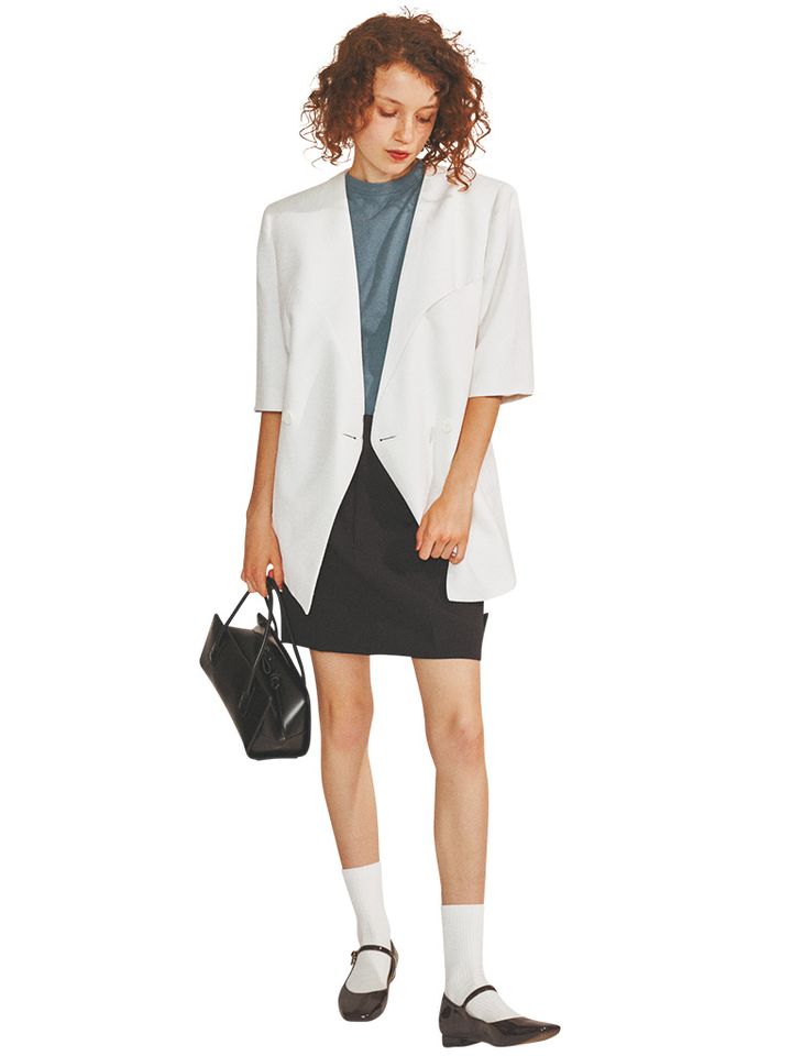 おかたく見えない秘訣は、直線と曲線のバランス。胸元からセンターへと弧を描くシームラインと、首まわりからすそに向かって角度をつけたネックラインとが、シャープなのに女らしい絶妙なさじ加減を演出。すっきり見えるノーカラーの半そでデザインも相まって、「白でジャケット」でも臆さず着られる1枚。