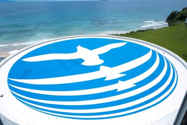 空を飛ぶカモメをイメージして設計された下田プリンスホテル。円形の形をしたレストランの広い屋根には、純白のカモメの姿が描かれています。