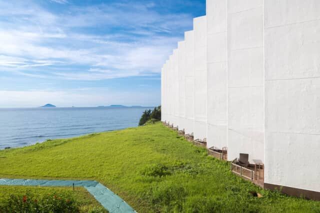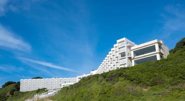 世界的に知られる建築家の黒川紀章(1936-2007)が設計した下田プリンスホテル。断崖の上に立つ純白の建物は、上空から見下ろすと、海に向けて羽を広げるカモメのイメージ。滞在中はぜひ時間を設けて、浜辺からその美しい建物の姿を楽しんでみてください。